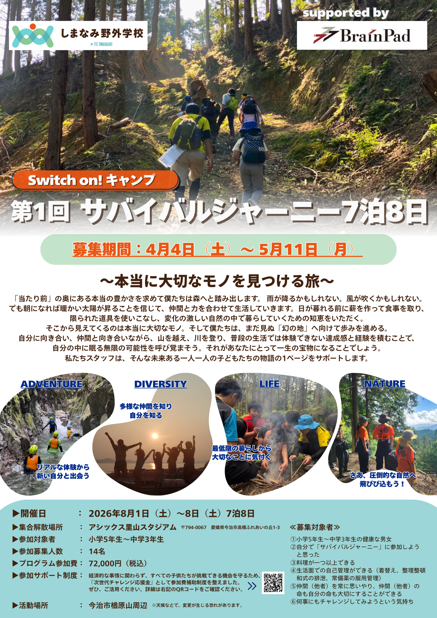 自分に向き合い、仲間と向き合いながら、山を越え、川を登り、普段の生活では体験できない達成感と経験を積むことで、自分の中に眠る無限の可能性を呼び覚まそう。